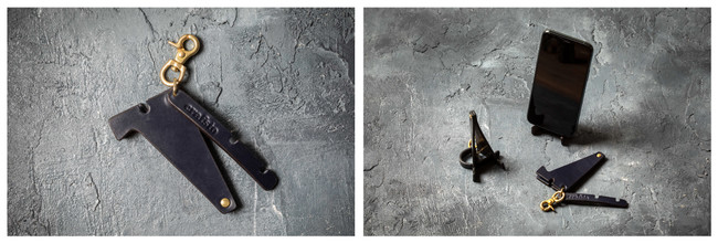 crafstoの製品にも使われている英国製のブライドルレザーを使用。3つのレザーパーツを組み合わせることでスマートフォンスタンドとなります。またフックがついており、カバンなどに付けて携帯することが可能です。