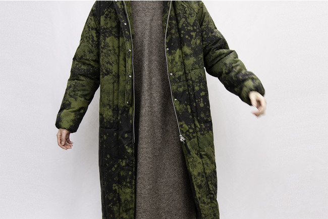 デビス社が日本で初めて導入する「Kornit Presto」を活用した、オリジナルプリントのアウターです。印刷時に水を使用しないため水質汚染がなく、エコに配慮。最新のプリント技術を使いながら、原始的なテクスチャーを先進的でミニマルなデザインに落とし込んでいます。