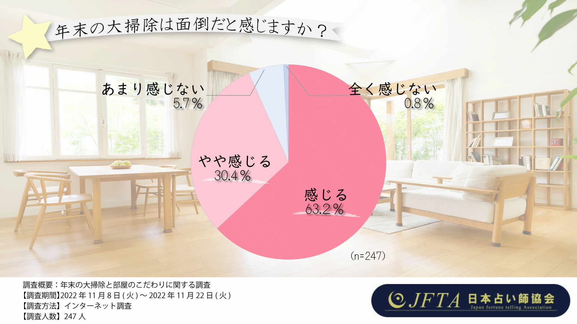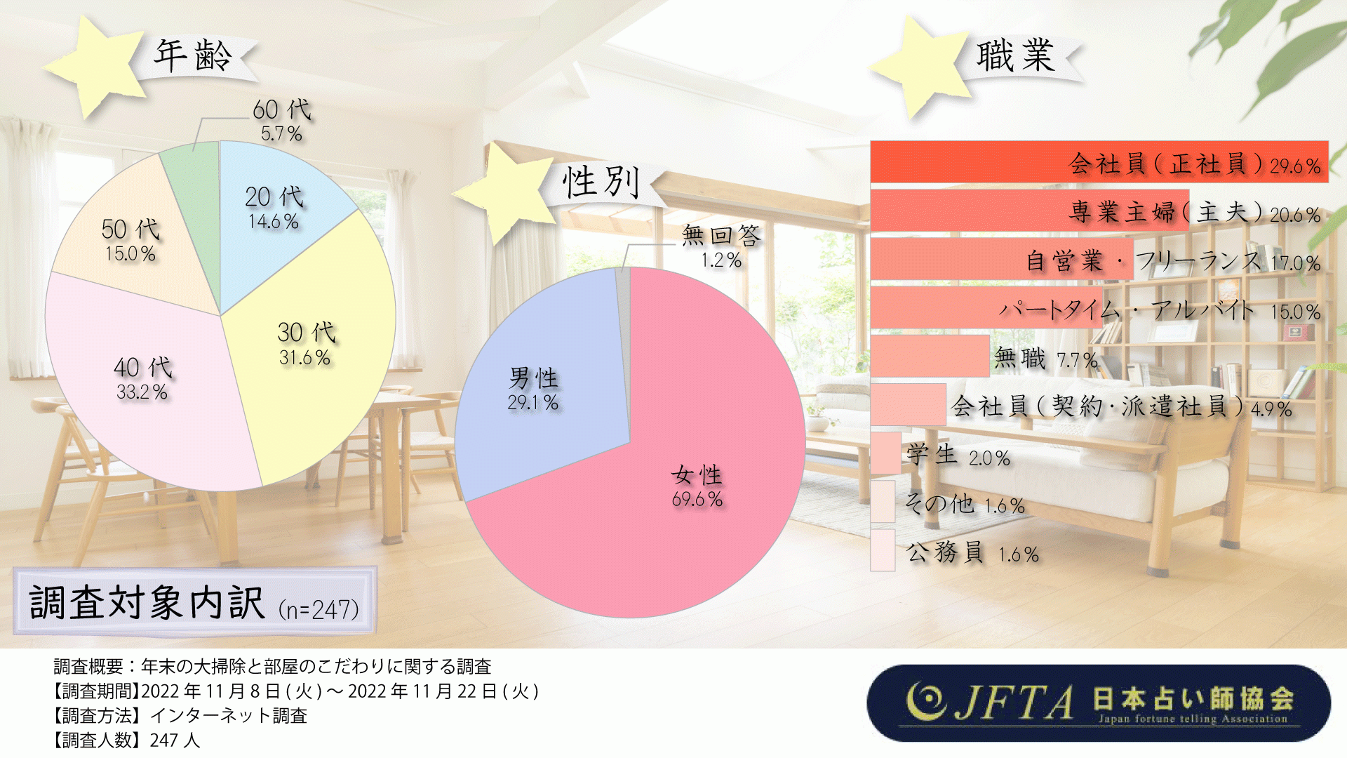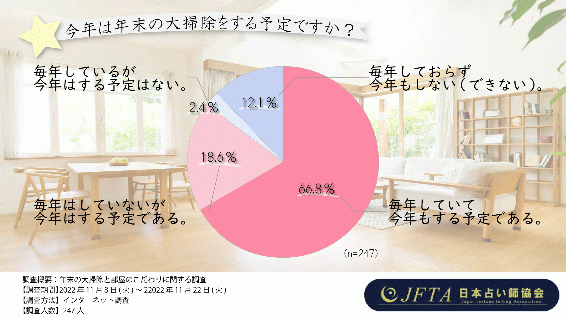 日本占い師協会(本社所在地:東京都中央区)は20代〜60代の男女を対象に「年末の大掃除と部屋のこだわり」についての調査を実施しました。
