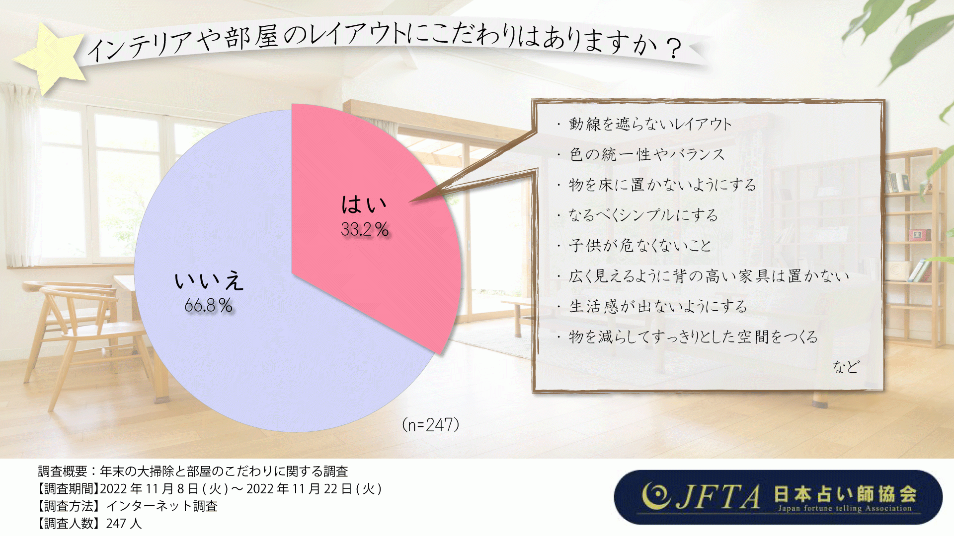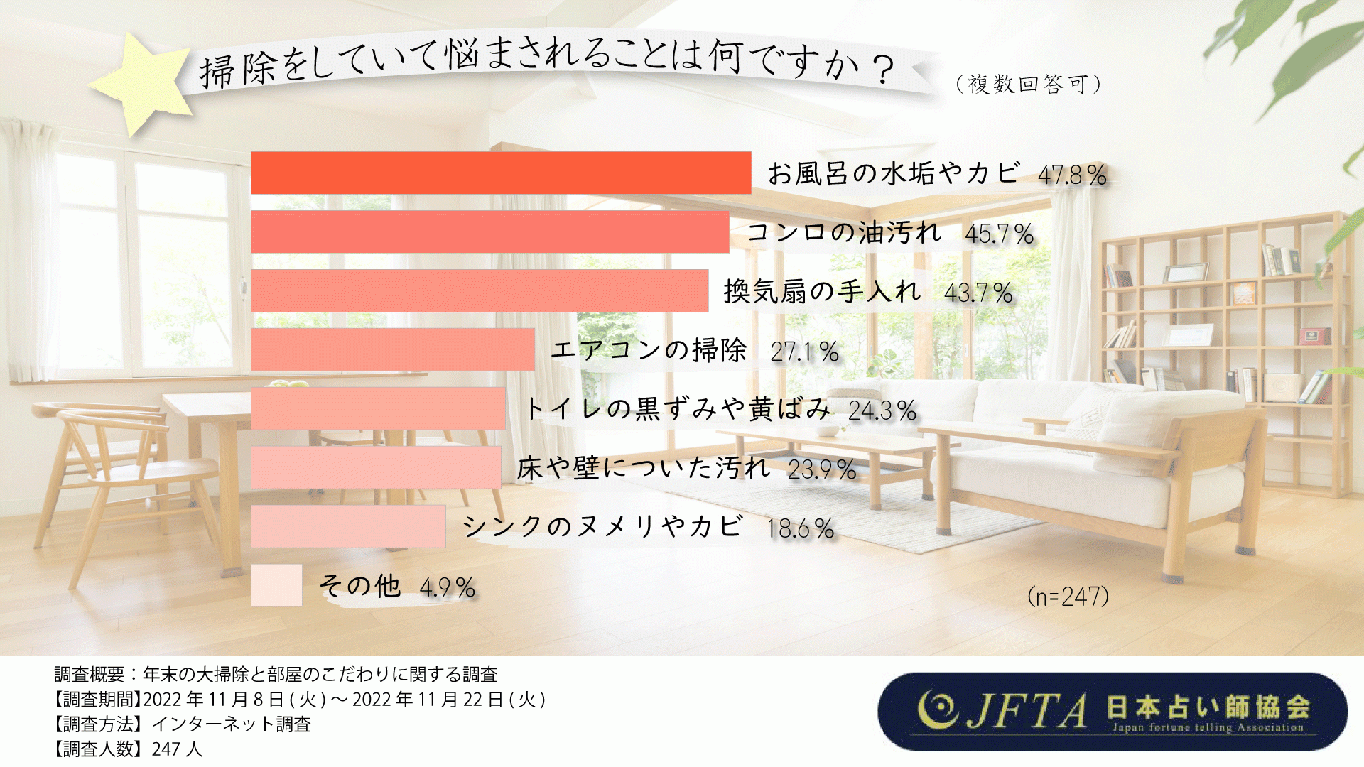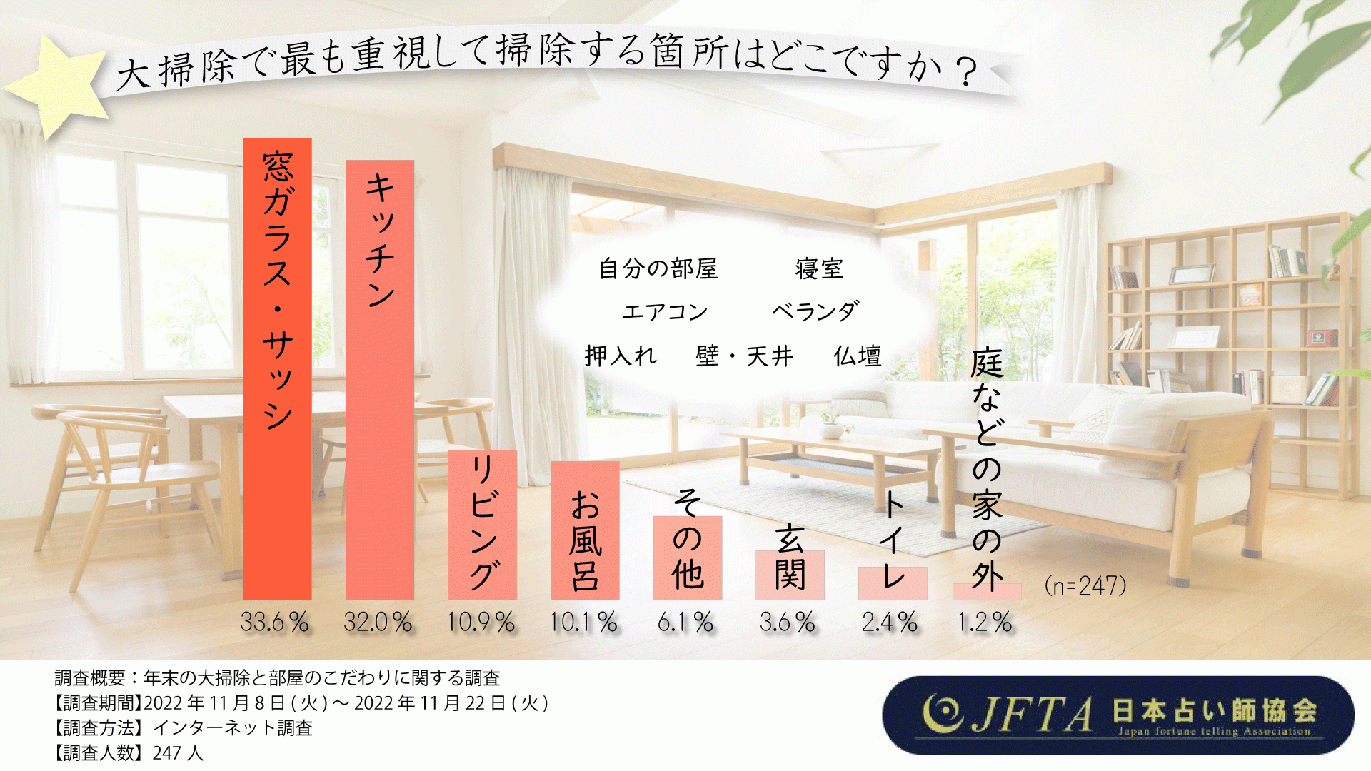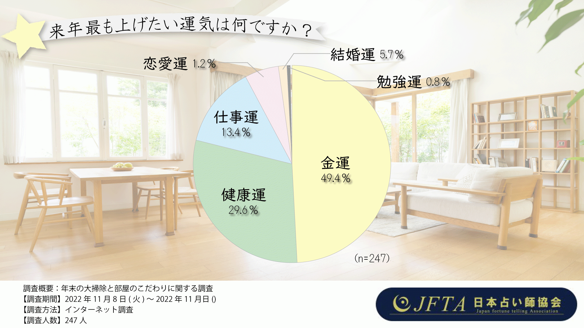 日本占い師協会(本社所在地:東京都中央区)は20代〜60代の男女を対象に「年末の大掃除と部屋のこだわり」についての調査を実施しました。
