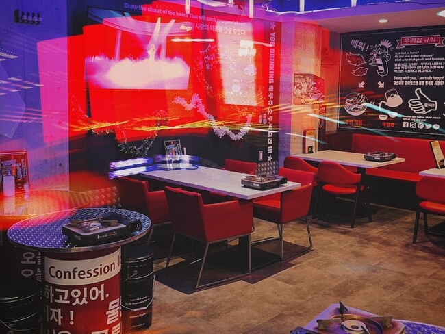 カラフルな提灯やポスター、テーブルはドラム缶席で「本場韓国の若者が集う店」という雰囲気が楽しい空間。飲み屋街という立地もあり2件目や3件目でのご利用や常連様も多く賑わっています。