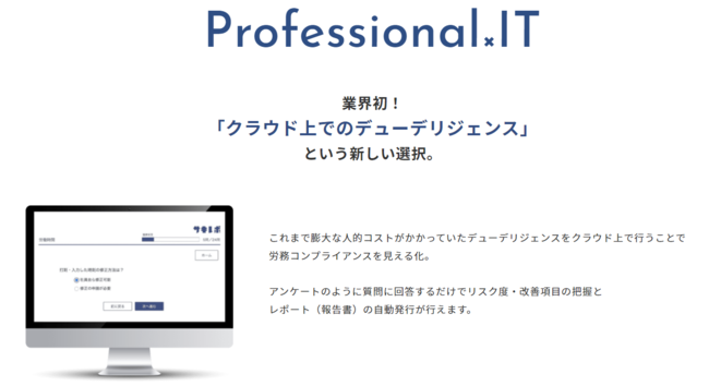 「サキレポ」は、これまで紙と人で行ってきた品質はそのままに、ネット上で気軽にリスク調査ができるクラウドデューデリジェンス(R)サービスです。これまで膨大な人的コストがかかっていたデューデリジェンスをクラウド上で行うことで労務コンプライアンスを見える化。アンケートのように質問に回答するだけでリスク度・改善項目の把握とレポート(報告書)の自動発行が行えます。(https://minamotoc.jp/sakirepo/)