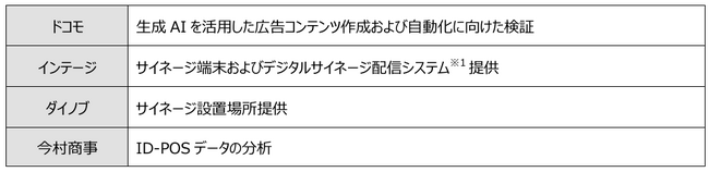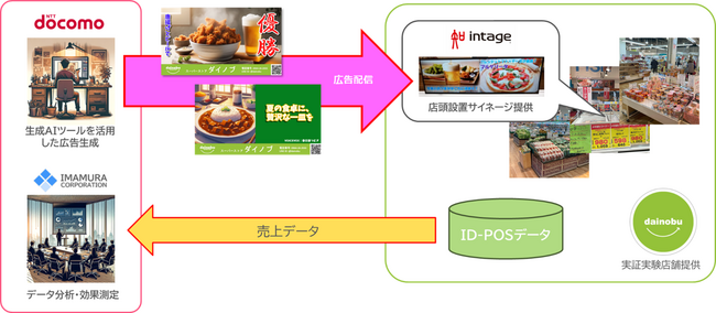 本実証実験では、熊本県および米国でスーパーを展開しているダイノブのスーパーダイノブ城南店において、ダイノブが販売強化を希望する商品の広告コンテンツをドコモが生成AIを活用して作成し、店内3か所に設置されたインテージのサイネージ端末およびデジタルサイネージ配信システムを通じ、消費者の購買意欲の促進し販売増に繋げる取組みを行いました。また販売結果についてはID‐POSデータ※2を今村商事がダイノブより取得・分析し、その効果について検証を行いました。