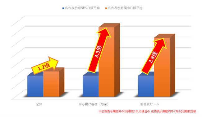 実証実験期間における売り上げの変動を検証しました。その結果、サイネージに広告を表示した対象商品について、広告表示期間における売上増は平均で1.2倍、最大で3.3倍の売上増加に寄与することが確認できました。