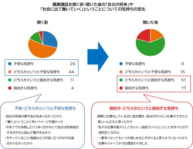 2021年度に横浜市内の中学校(2年生)で実施した『みらいteacher』のプログラムでは、講話後に「自分の将来」や「社会に出て働いていく」ことに『前向きな気持ち』になった生徒の割合が18%から79%にアップするなど、10代の若者たちの未来に立ち向かっていく意欲に、大きな変化をもたらしています。