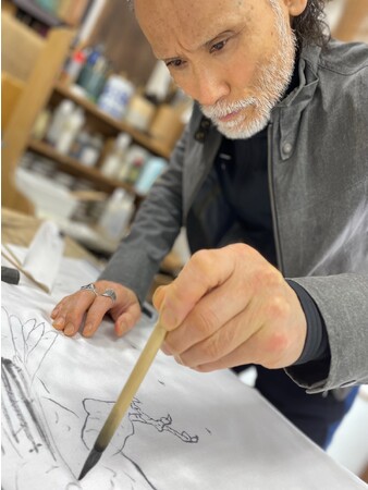 絹布に染料を用いて、紙に描く墨彩画のごとく、滲みや色の濃淡、線の強弱を筆のストロークで大胆かつ繊細に描き上げ、片岡氏ならではの活き活きとした感性が布の上でも存分に発揮されています。今回、その素描した原画に、東京友禅作家の生駒暉夫氏が地染めを施し、唯一無二の額裏、限定15点を期間限定で一堂に展示いたします。
