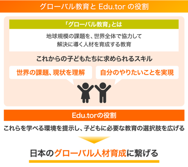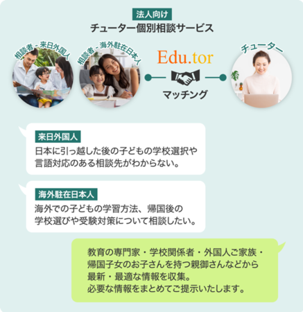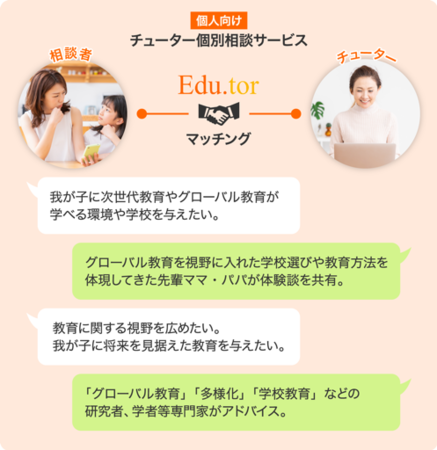 株式会社Edu.torは、2022年5月、教育のプロやグローバル教育を選択した実体験を持つ先輩ママ・パパに、グローバル教育の相談ができる「チューター個別相談サービス」(https://edutor-tutor.com/ )をリリース。現在はグローバル教育を提供する学校情報がまとまった「学校情報サイト」(G'school Navi/ジースクールナビ)のリリース準備中です。「チューター個別相談サービス」と「学校情報サイト」を1つのプラットフォームで繋ぐことで、グローバル教育に関する情報を横断的に提供することを目指します。