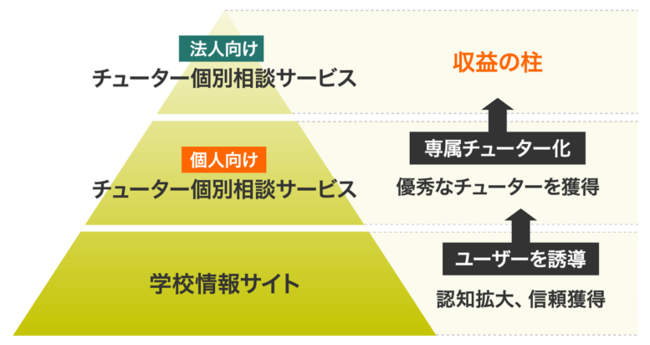 「Edu.tor」は、ピラミッド型のビジネスモデルです。事業の土台として、「学校情報サイト」やセミナーを通じて弊社サービスの裾野を広げ、認知拡大および信頼度向上を目指します。また、学校情報サイト、個人、法人それぞれのチューター個別相談サービス、3つのサービスをそれぞれ接続し、利用者が各サービスに流入する導線を構築することで利用価値と収益の最大化を図ります。