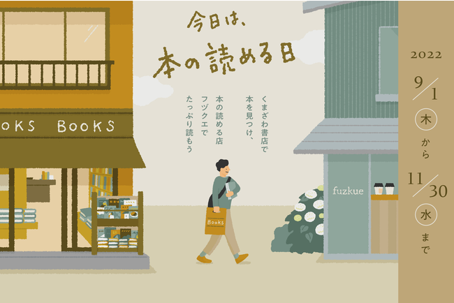 本の読める店fuzkue(以下フヅクエ。所在地:東京初台・下北沢・西荻窪、URL: https://fuzkue.com/ )は、くまざわ書店東京オペラシティ店(所在地:東京初台)とともに、「本の読める日キャンペーン くまざわ書店で本を見つけ、本の読める店フヅクエでたっぷり読もう」と称し、9月1日から11月末日まで連携企画を実施します。8月実施の本屋B&Bとの連携に続き、本屋さんで本を買ったその足で本の読める店に行ってたっぷり本を読むという、最高の読書の一日の提案です。