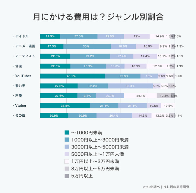 また、月に5,000円以上使っている推し活女子が最も多かったジャンルは「アイドル」で38.2%、月に1万円以上使っている推し活女子が最も多かったジャンルは「声優」で37.8%という結果となった。