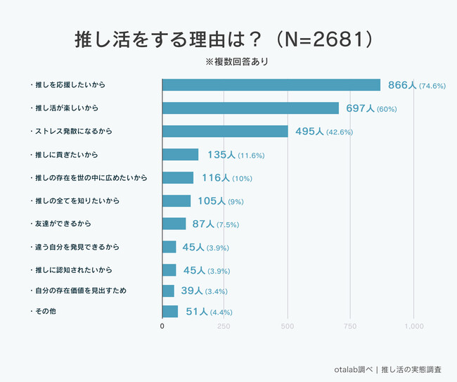 特に多かった推し活をする理由としては、「推しを応援したいから」「推し活が楽しいから」「ストレス発散になるから」の3つとなった。
