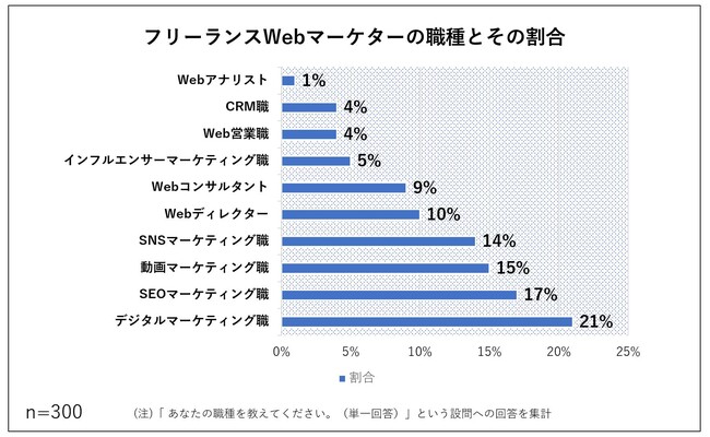 全国20代〜60代のフリーランスWebマーケター300人に調査をしたところ、職種で最も多かったのがデジタルマーケティング職で21%、続いて、SEOマーケティングが17%、動画マーケティング職が15%と続きました。