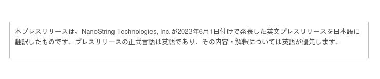 ナノストリングは空間生物学領域における先進企業であり、基礎研究およびトランスレーショナル研究のための革新的ソリューションのエコシステムを提供することで、お客様が生物学の地平を広げるお手伝いをしています。GeoMx(R)デジタル空間プロファイラーは160以上の査読付き論文に取り上げられた柔軟性と一貫性を兼ね備えたソリューションであり、全組織検体の利点に遺伝子およびタンパク質のデータを組み合わせて、1枚のFFPEスライドで空間的な全トランスクリプトーム解析およびプロテオミクス解析を行えます。CosMx(TM)空間分子イメージャーは、FFPE検体で解析が行える、空間マルチオミクスを利用したシングルセル・イメージングプラットフォームで、自然環境におけるシングルセルマッピングを行うことで、深い生物学的知見と新たな発見を1回の実験で得ることができます。AtoMx空間バイオインフォマティクスプラットフォームは、高度な分析機能と世界規模での連携機能を備えたクラウドベースのインフォマティクスソリューションで、時と場所を選ぶことなく空間生物学研究に有用な知見を得ることができます。当社の各種研究用装置の土台となっているnCounter(R)解析システムは7,000以上の査読付き論文に取り上げられており、数百種以上の遺伝子、タンパク質、miRNA、コピー数多型の発現解析を安全かつ容易に、また高い感度と精度で行うことができます。より詳しい情報が知りたい方はウェブサイトをご覧ください(www.nanostring.com)。