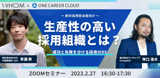 中途採用・新卒採用における採用戦略設計〜遂行までを支援する株式会社WHOM(本社:東京都渋谷区、代表取締役:早瀬恭、以下WHOM)は、株式会社ワンキャリア(本社:東京都渋谷区、代表取締役:宮下尚之、以下ワンキャリア)と共催で、2023年2月27日(月) 16:30〜無料オンラインウェビナー「生産性の高い採用組織とは?〜 成功と失敗を分ける採用のDX〜」を開催いたします。