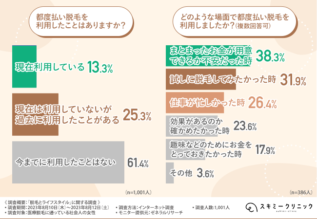 そこで今回、美容クリニック『スキミークリニック』(https://sukimi-clinic.jp/?refmedia=100025)は、医療脱毛に通っている社会人の女性を対象に、都度払い脱毛とライフスタイルに関する調査を実施しました。
