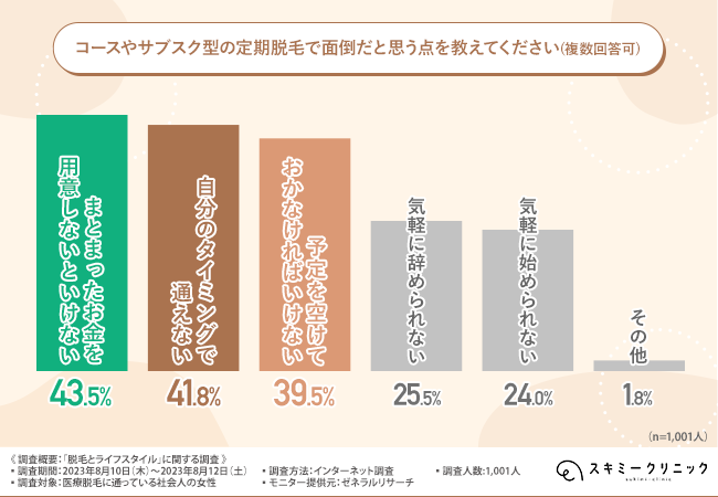 一方、コースやサブスク型の脱毛システムは、多額のお金や時間のやり繰りが負担だと感じる方が多いことも明らかになりました。