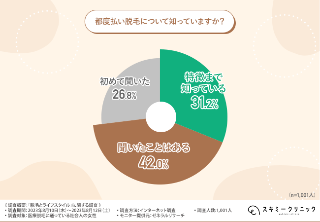 「都度払い脱毛について知っていますか?」と質問したところ、『特徴まで知っている(31.2%)』『聞いたことはある(42.0%)』と約7割の方が「知っている」と回答していることから、都度払い脱毛の認知が広がってきていると言えそうです。