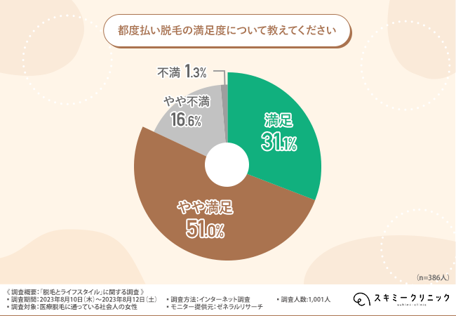 「都度払い脱毛の満足度について教えてください」と質問したところ、『満足(31.1%)』『やや満足(51.0%)』と8割以上の方が満足していると回答し、都度払い脱毛の満足度は高いことが明らかになっています。
