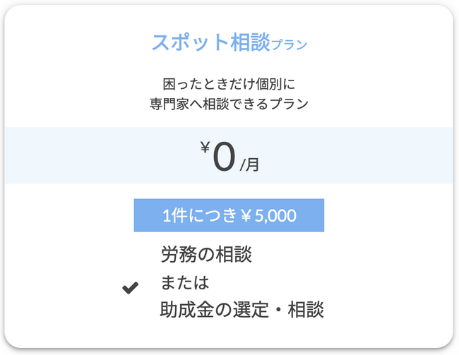 今回のリニューアルで、これまではなかったスポット相談のプランが登場しました。こちらは、月額0円で困った時だけ個別に専門家に相談できるプランです。1回の相談で、労務相談、または、助成金の選定・相談、いずれかの相談が可能です。