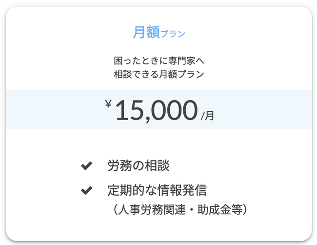 月額プランは、労務相談、助成金の選定・相談など、困った時にいつでも(月に何回でも)専門家に相談できるプランです。これまでは、3種類の月額プランからお選びいただく形式となっておりましたが、今回のリニューアルで月額プランは1種類となりました。下記トピックに関する労務相談ができるプランとなります。