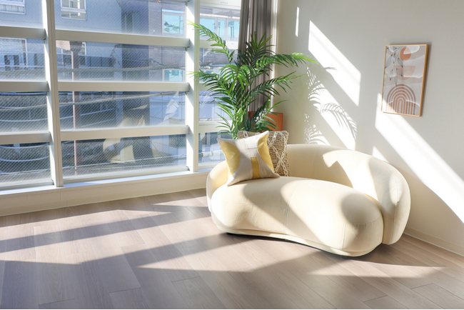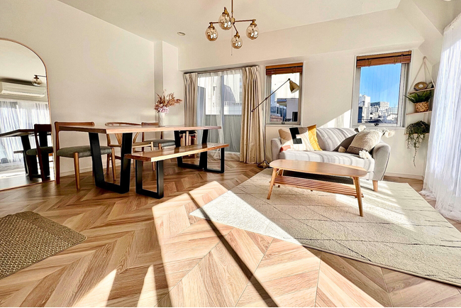 一面窓で自然光もきれいに入り、ベッドやダイニング、ソファーブースを用いた生活シーンの撮影や