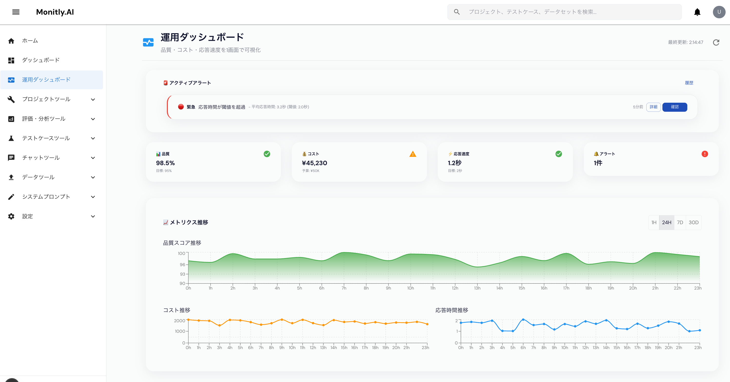 実運用時の品質・コスト・応答速度をリアルタイムで可視化できる新ダッシュボードを追加。異常検知・アラート通知・メトリクス履歴分析など、継続的なモニタリングを可能にしました。