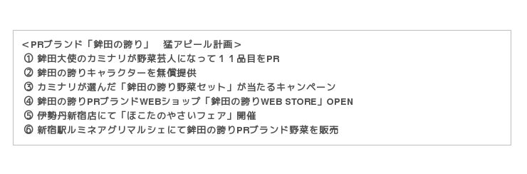 PRブランド「鉾田の誇り」では「カミナリによる11種の野菜漫才」の他、「鉾田の誇りキャラクターを無償提供」「鉾田の誇り野菜セットが当たるキャンペーン」「鉾田の誇りPRブランドWEBショップOPEN」「伊勢丹新宿店にてほこたのやさいフェア開催」など、今後様々な形で鉾田市の野菜を猛アピールしていきます。