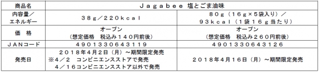 カルビー株式会社(本社:東京都千代田区、代表取締役社長兼COO:伊藤 秀二)は、皮付きじゃがいもスティックでおなじみの「Jagabee」から、期間限定の味「Jagabee 塩とごま油味」を4月2日(月)、コンビニエンスストア先行で全国発売します(7月上旬終売予定)。※コンビニエンスストア以外のお店及び本商品80gは4月16日(月)から販売します。