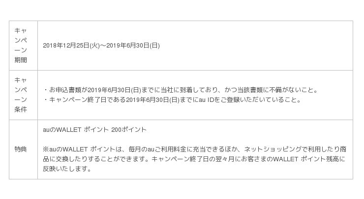 2018年12月25日(火)〜2019年6月30日(日)までの期間、「auのiDeCo」にお申し込みいただいたお客さまに一定の条件でWALLET ポイントをプレゼントいたします。