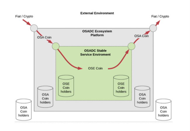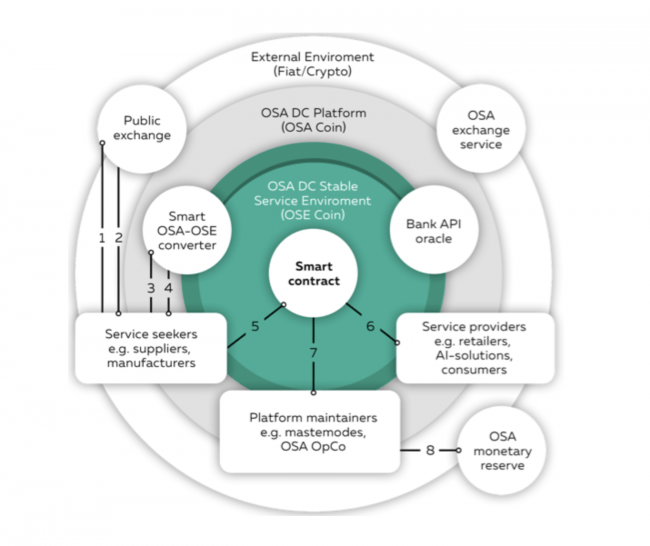 したがって、OSA DC エコシステムは実経済においてサービスを可動させるために 2 種類の通貨を流通させることにしました。外部での取引を行う際、そしてOSA DC の参加者(買い物客と製品の最終消費者も含まれる)へのリワードを支払うために用いられる OSA コインと、プラットフォーム内部の取引処理で用いられる OSE コイン(ステーブルコイン)です。