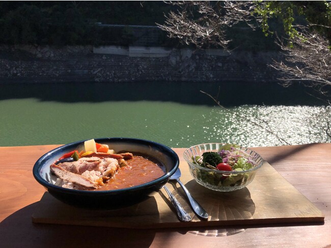・昼食:高知の木材を使用したログハウスの店舗で、大豆ミートと米粉と自家製燻製と野菜を使用したメニューを提供している 「café IVY(アイヴィー)」にて昼食。物部川を眺めながら、大豆ミートのランチやトッピングが選べるベジタブルカレーなど、様々なメニューの中から注文。