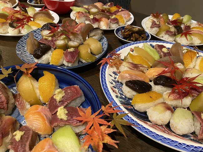夕食:古民家「百年舎BASE」で、チームビルディング研修を兼ねて、山里の食材を用いて盛り合わせた山間部に伝わる郷土料理「田舎寿司」の料理体験。