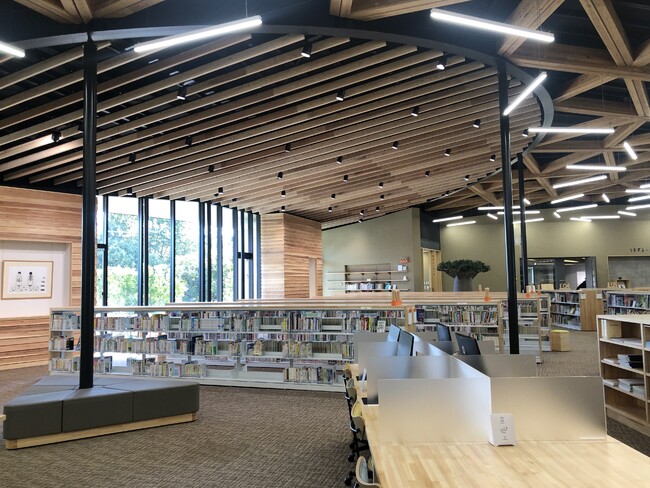 香美市立図書館「かみーる」は今年11月3日にオープンした新築施設。図書館内の一部には香美市産のスギやヒノキの木材が使用されている。