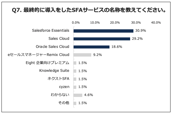 次に、Q1で「導入に至った」と回答した人に、「Q7.最終的に導入をしたSFAサービスの名称を教えてください。」(n=65)と質問したところ、30.9%の人が「Salesforce Essentials」、次いで29.2%「Sales Cloud」、18.6%「Oracle Sales Cloud」の順になりました。