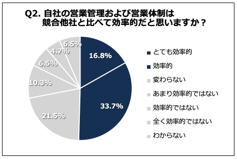 次に、「Q2.自社の営業管理および営業体制は競合他社と比べて効率的だと思いますか?」(n=107)と質問したところ、「とても効率的」「効率的」と答えた人が50.5%と、効率的な営業体制と実感している人が多いことが判明しました。