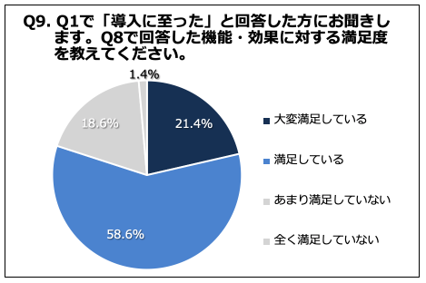 続けて、Q1で「導入に至った」と回答した人に、「Q9. Q8で回答した機能・効果に対する満足度を教えてください。」(n=70)と質問したところ、「大変満足している」「満足している」と回答した人が80.0%と、大半の人が期待していた機能や効果を実感でき満足している人が多いことが明らかになりました。
