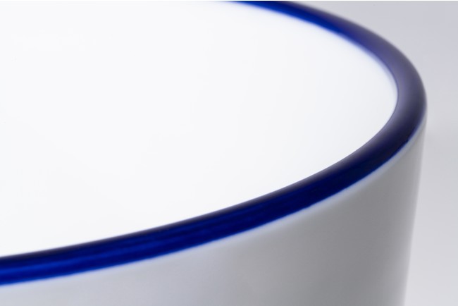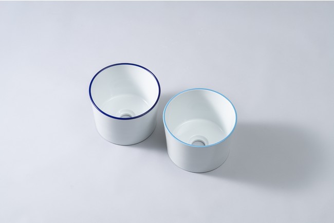 POCKET定番色「はさみホワイト」の上端に丸くフチ取りをつけた2種。 波佐見焼特有のほのかな青みのあるホワイトに馴染む組み合わせとして、フチには水色と青色の2色。