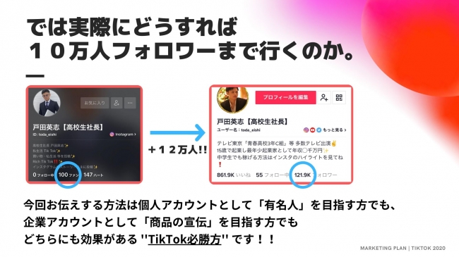 実際に"戸田英志"はたった5ヶ月で自身の"TikTok"のフォロワーを10万人以上付け、
