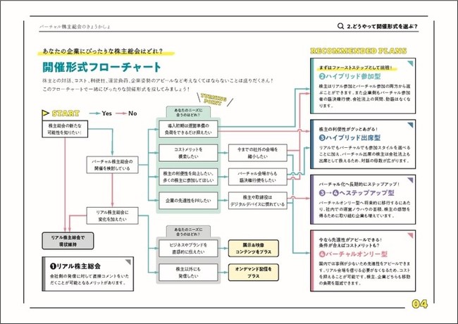 内容:バーチャル株主総会ってなに? / バーチャル株主総会で広がる新たな株主総会の可能性 /開催形式フローチャート / 運営視点で開催形式を比較しよう! / ハイブリッド型開催で選ぶ2つの開催方式のメリットと留意事項 / バーチャル株主総会までのロードマップ / バーチャル株主総会4ポイント全解剖! / バーチャル株主総会までのTo Do / 株主総会担当者のリアルな一言