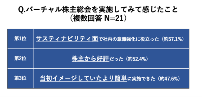 バーチャル株主総会を経験した回答者全員が、今後も「積極的に実施したい」「実施したい」と回答しました。また、実施してみて感じたこととして「サステナビリティ面で社内の意識強化に役立った」「株主から好評だった」との回答が過半数を超えました。導入時に課題を感じている人が多い一方で、これからもバーチャル株主総会の需要が高まると考えられます。