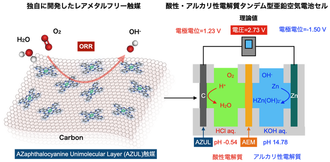 図1 本研究で開発したAZUL触媒電極と酸性・アルカリ性電解質タンデム型亜鉛空気電池セルの模式図