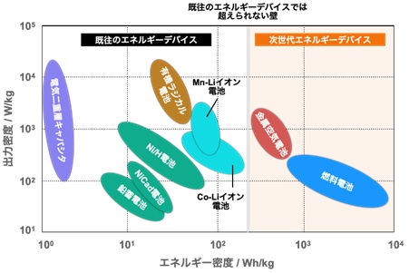 図2.ラゴンプロット。横軸にエネルギー密度(容量)、縦軸に出力密度をプロットしている。
