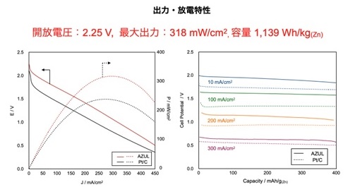 さらに、電解液室を二つにし、その界面をアニオン交換膜で隔てることで、酸性・アルカリ性電解質をタンデムに配置したタンデム型セルを作製し、AZUL触媒正極、Pt/C正極を用いた亜鉛空気電池を作製しました。(図1右)酸性電解質として3.5 M 塩酸を、アルカリ性電解質として6.0 M 水酸化カリウム水溶液を用いて、出力特性と放電特性を評価したところ、AZUL触媒を用いたセルにおいて、開放電圧最大2.25 V、最大出力318 mW/cm2、最大容量1,139 mWh/g(Zn) (Wh/kg(Zn)、負極の亜鉛重量あたりの容量)を達成しました。これはこれまで報告されているレアメタルフリー正極触媒を用いた亜鉛空気電池の中で最も高電圧・高出力です。
