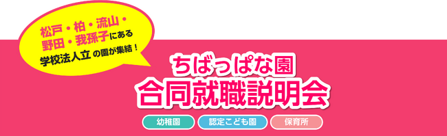 東葛エリアにある「ちばっぱな園」が集結する合同就職説明会を開催します。これから就職活動を開始する、幼稚園教諭・保育士を目指す学生の皆さんにピッタリの機会です。