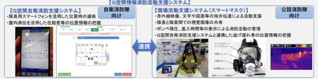 赤外線カメラやディスプレイ等を付加し多機能化を図ったスマートマスクと通信機能を付加したタブレットにより構成され、現場の消防隊員と後方の指揮者(隊長・現場指揮本部)間で情報(カメラ映像等)を共有することができるシステム。