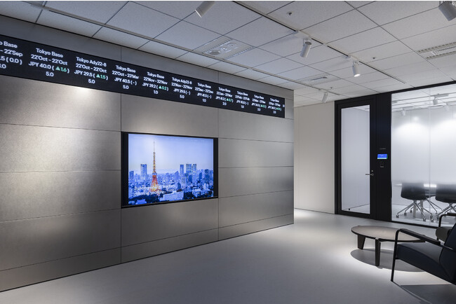 ・お客様用のエントランスと執務スペース内に、直近のトランザクションデータを常時投影する電光掲示板を設置しました。営業部以外の社員も日々値動きするマーケットのダイナミクスを肌で感じられ、当社が掲げるミッション “Building energy markets coloring your life” を強く意識することにもつながります。電光掲示板には、さまざまなメッセージを投影することもでき、ミッション実現やバリュー実行に向けた重要な道しるべとなります。
