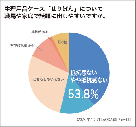 生理がない方々に、生理用品ケースについて話題に出しやすいか調査を行ったところ、半数以上の方が「抵抗感ない、やや抵抗感ない」とご回答いただきました。「ケースがかわいい」「ポップなデザインでよい」などのコメントもいただいております。