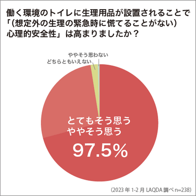 この度、生理用品設置の実証実験でも調査を行い「働く環境のトイレに生理用品が設置されることで、(想定外の生理の緊急時に慌てることがない)『心理的安全性』は高まりましたか」に対して、97.5%がYESと回答。