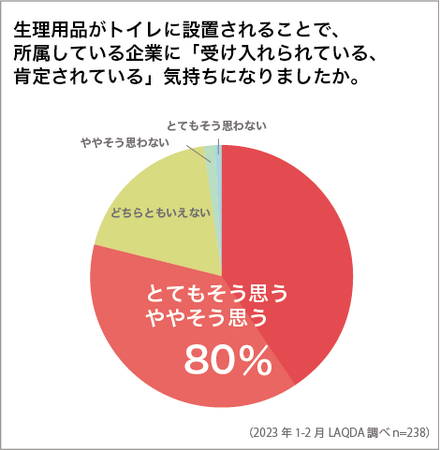 また、「生理用品がトイレに設置されることで、所属している企業に『受け入れられている、肯定されている』気持ちになりましたか」との質問に、80%がYESと回答しました。