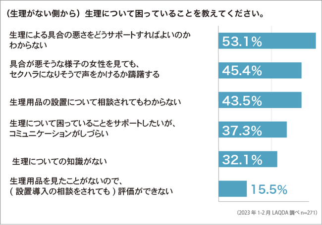 今回は、生理がない人を対象に対象に「生理について困っていること」についての調査を行いました。その結果、「生理による具合の悪さをどうサポートすればよいのかわからない」との回答が半数以上。「具合が悪そうな様子の女性を見ても、セクハラになりそうで声をかけるか躊躇する」「生理について困っていることをサポートしたいが、コミュニケーションがしづらい」などコミュニケーション周りの課題が挙げられました。